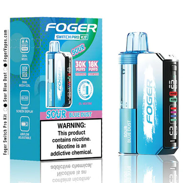 Sour Blue Dust – Foger Switch Pro 30K Disposable Kit delivers a bold, candy-inspired flavor packed with tangy sour blue raspberry and a sweet dusted-candy finish. Perfect for vapers who love playful, nostalgic flavors with a sour kick, this vape blends sweet and tart notes in every puff. Powered by mesh coil technology, the Foger Switch Pro 30K provides consistent vapor and bold flavor. The dual-mode system offers up to 30,000 puffs in Regular Mode, or switch to Turbo Mode for denser clouds and intensified flavor (up to 20,000 puffs).
