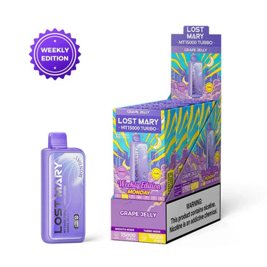 Grape Jelly – Lost Mary MT15000 Turbo Disposable brings the rich sweetness of grape jelly with a smooth finish that satisfies from first puff to last. Engineered with a dual mesh coil, this disposable vape offers both Smooth (11W) and Turbo (22W) modes, delivering up to 15,000 puffs in Smooth mode. With a smart display showing battery life and e-liquid levels, a generous 16mL tank, and a USB-C rechargeable 600mAh battery, the Lost Mary MT15000 Turbo delivers long-lasting power and a bold grape flavor in a sleek, portable design.